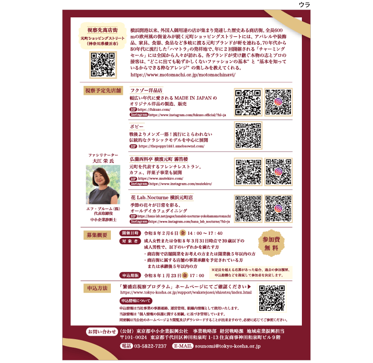 「繁盛店視察プログラム(横浜市)のチラシデザインを担当させていただきました。本プログラムは、都内や地方都市の商店街を訪問し、繁盛店の経営手法を現地で学ぶ機会を提供するものです。今回は、横浜市「元町ショッピングストリート」にて開催されます。特に、都内の商店街で新規事業を検討されている方々にとって、大変貴重な学びの場になります。(申込締切:令和8年1月23日(金)17時まで)